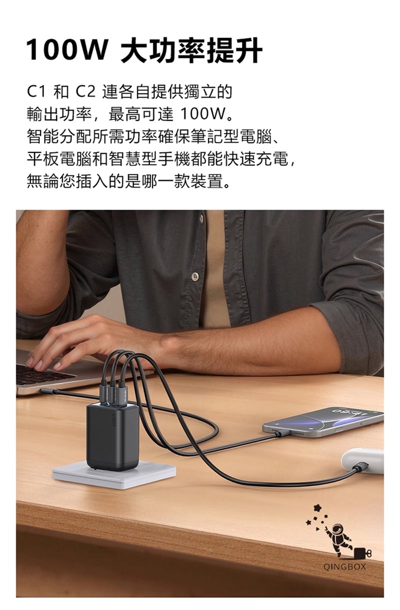 輸出(USB-C1/C2):5V/3A,9V/3A,12V/3A,15V/3A,20V/5A,100W Max.
