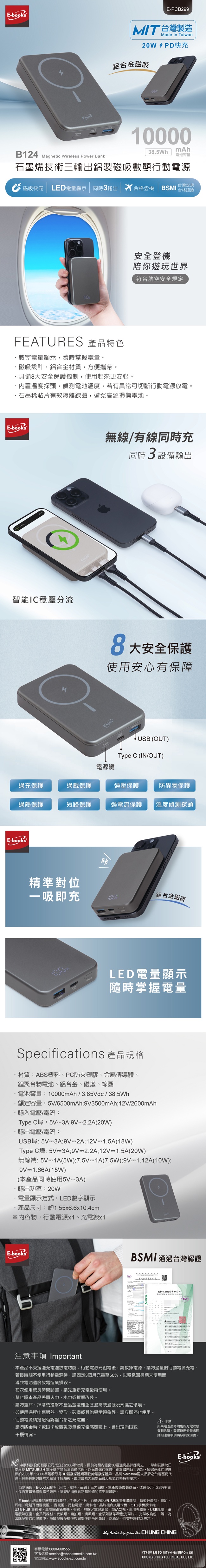 E-books B124【台灣製造】石墨烯技術三輸出鋁製磁吸數顯行動電源
