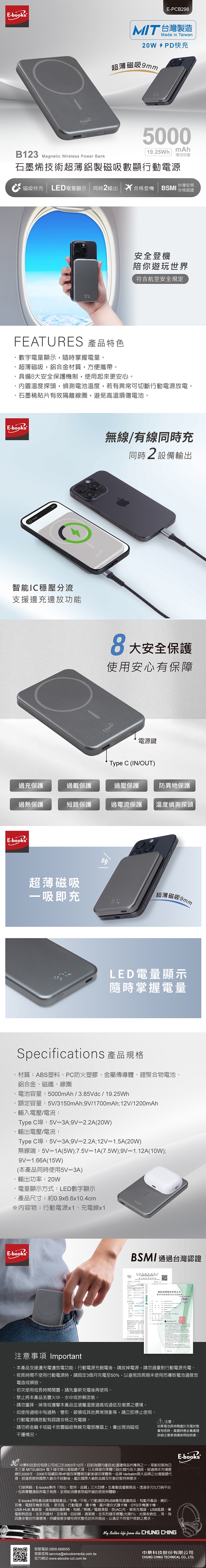 E-books B123【台灣製造】石墨烯技術超薄鋁製磁吸數顯行動電源