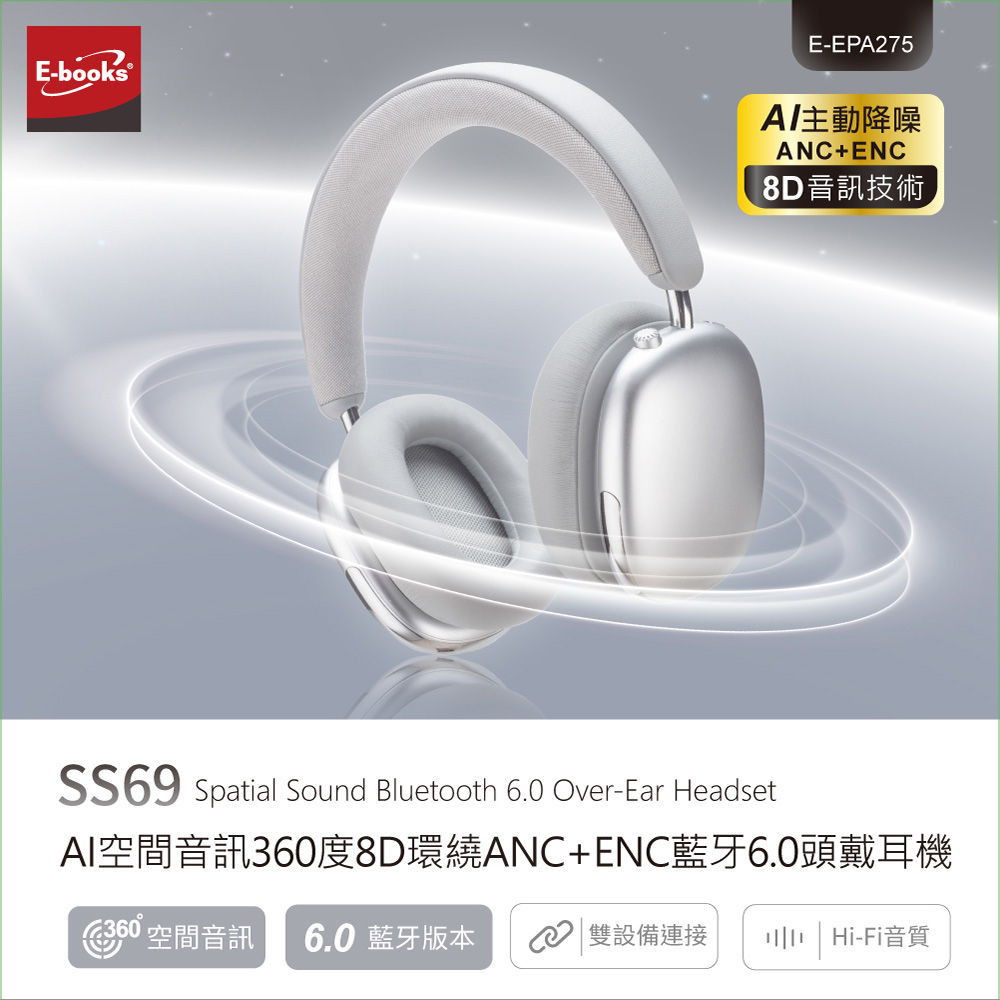 E-books SS69 AI空間音訊360度8D環繞ANC+ENC藍牙6.0頭戴耳機