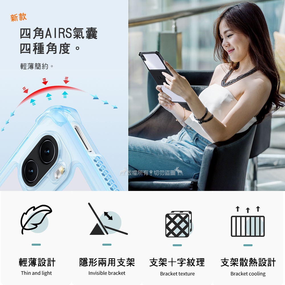 高韌性材質,新款四角AIRS緩衝氣囊,易拆卸,不傷機