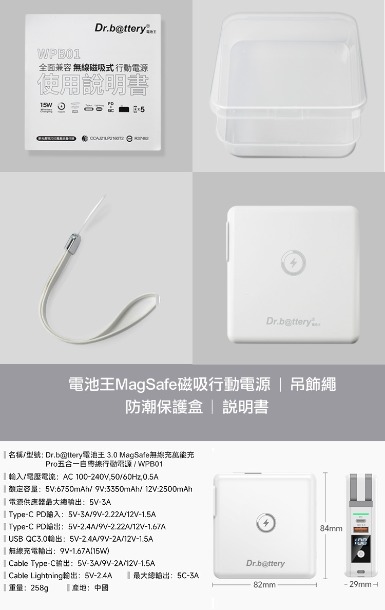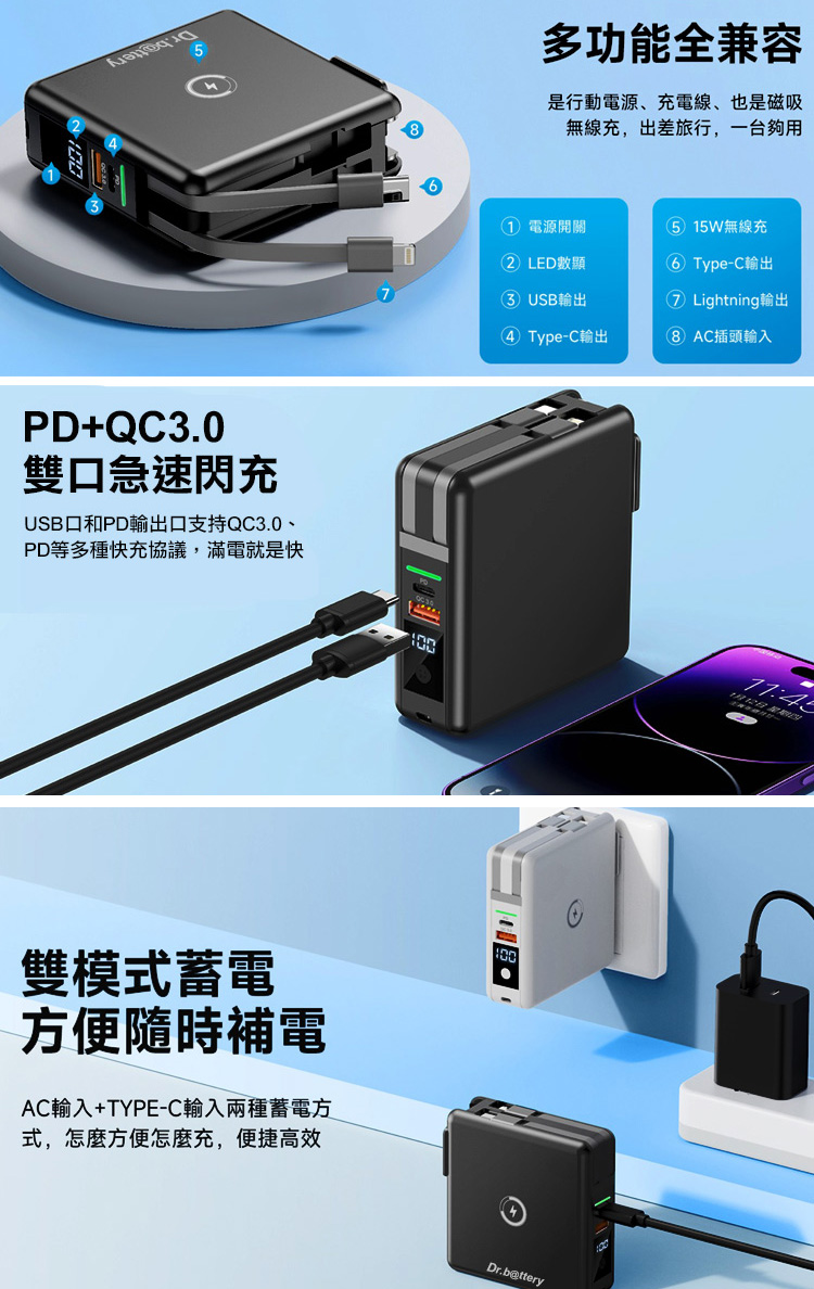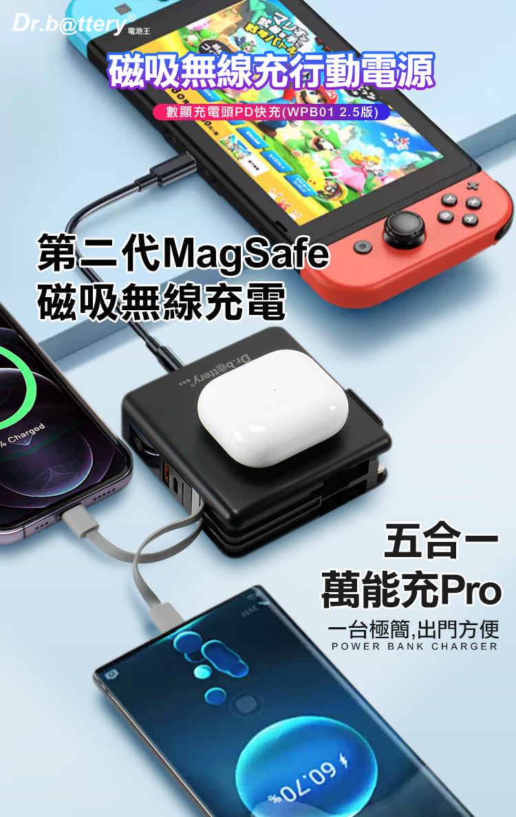 【Dr.b@ttery電池王】MagSafe多功能無線充電+自帶線行動電源+數顯充電頭PD快充(五合一 萬能充Pro