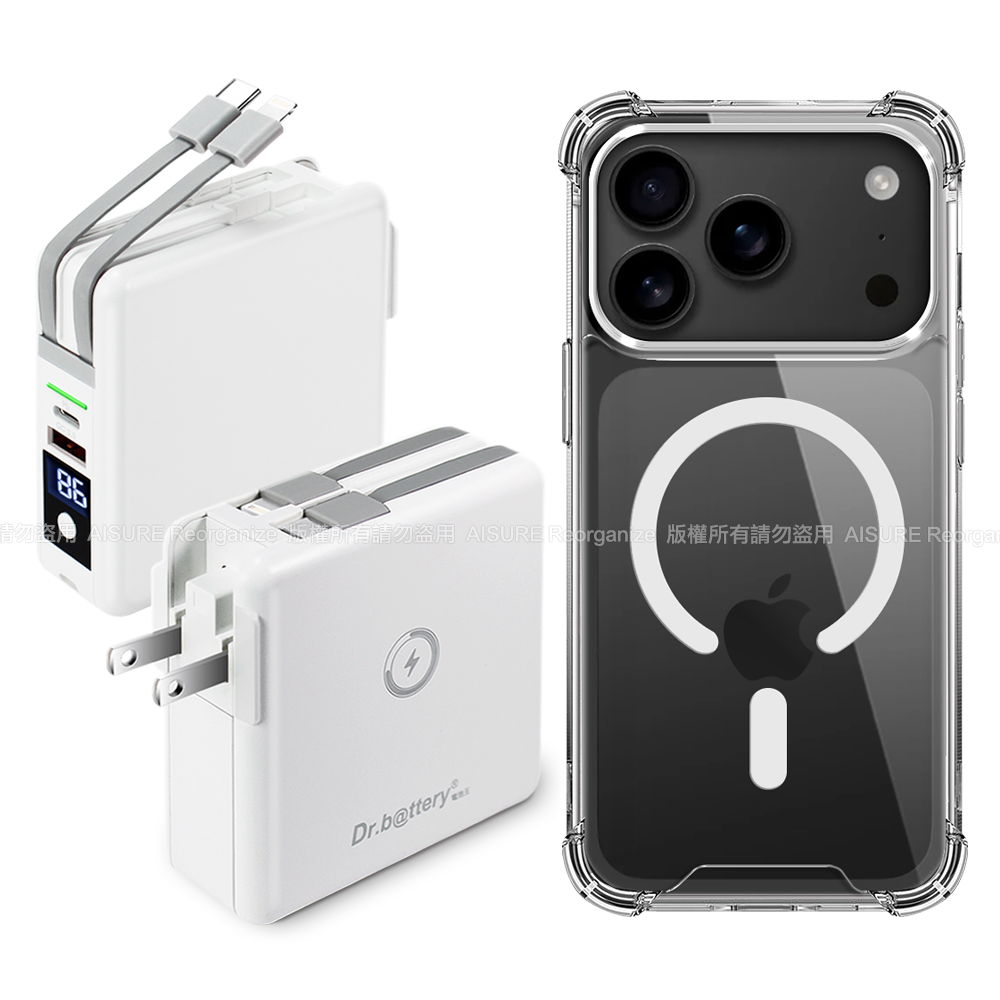 Dr.b@ttery電池王 多功能MagSafe無線充電+自帶線行動電源白+贈 iPhone17 Pro Max 磁吸殼
