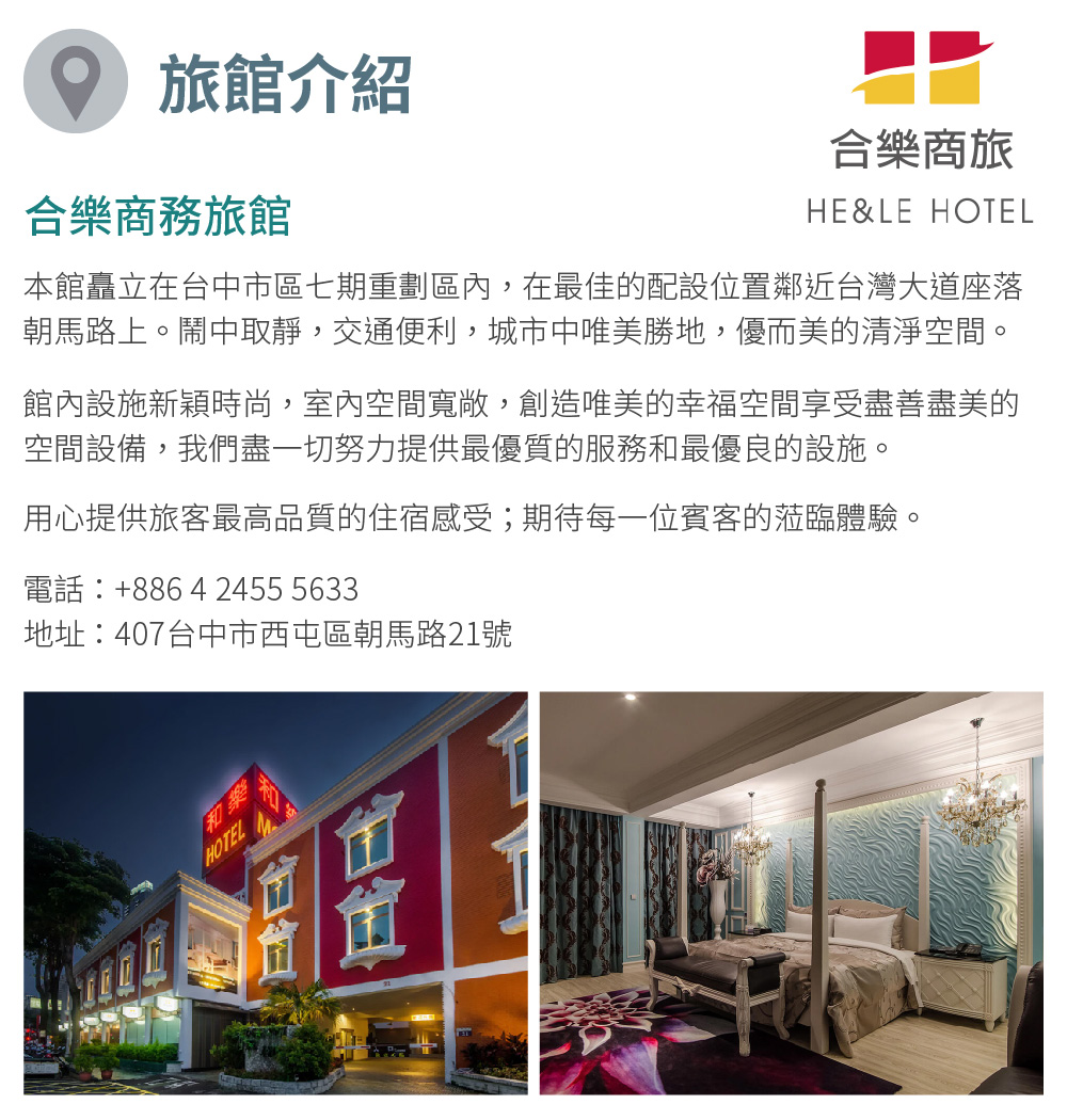 台中【合樂商務設計旅店】雙人車庫房一泊一食住宿券(MO)