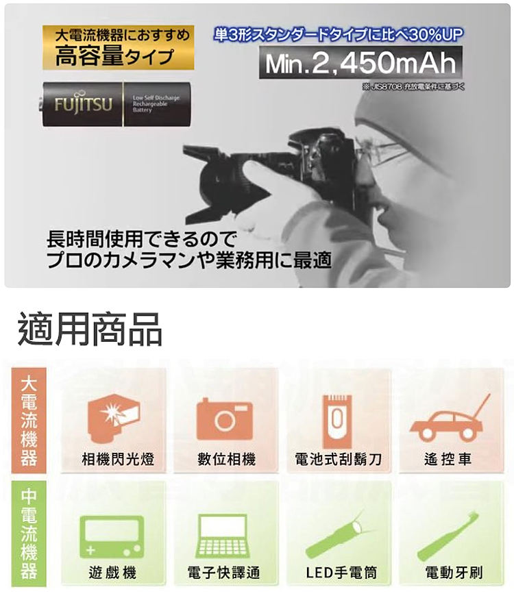 日本製 Fujitsu富士通 低自放電高容量2450mAh充電電池HR-3UTHC (3號12入)