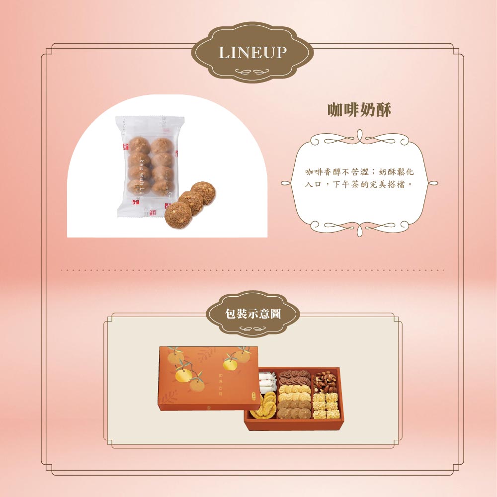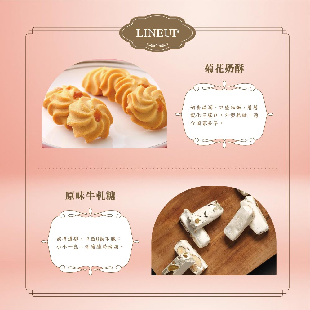 牛軋糖64克、蝴蝶酥3入(1片/入)、咖啡奶酥8入、