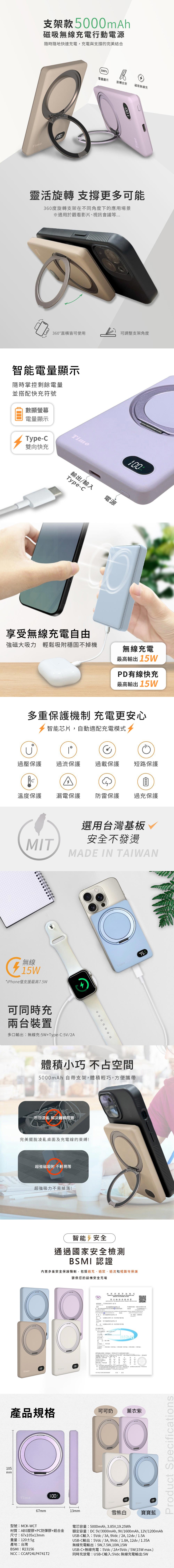 【Timo】PD快充 旋轉支架數顯超薄磁吸無線行動電源5000mAh-薰衣紫