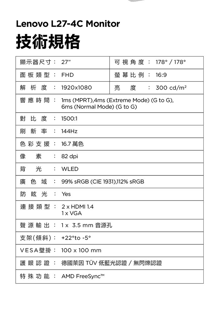 Lenovo L27-4C 67DEKAC1TW 27吋顯示螢幕