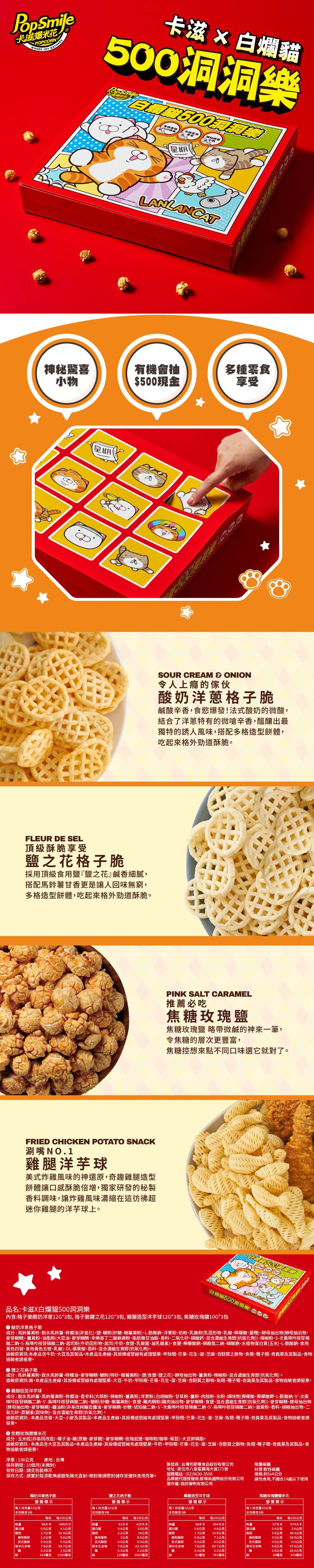 卡滋 X 白爛貓 500 洞洞樂,超人氣白爛貓聯名設計,一盒內含 12 包精選零食,每開一洞都是驚喜享受,還有機會獲得現金 500 元或神秘小禮,讓吃零食也能充滿期待與樂趣。無論送禮、聚會或自己開箱,都能感受滿滿趣味與話題感。