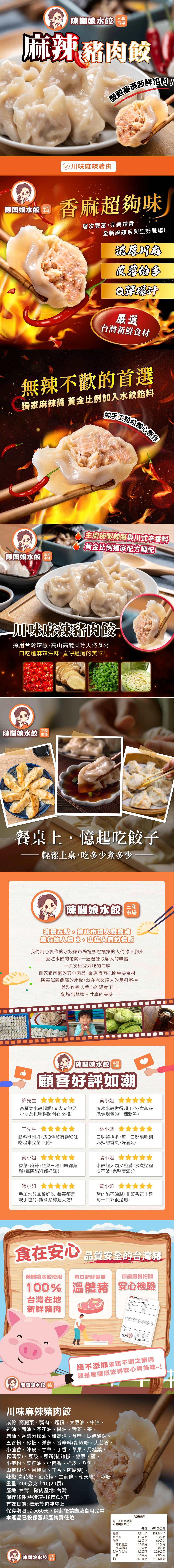 嚴選新鮮豬肉,搭配川味麻辣香料細心調餡,入口先麻後辣、香氣層層堆疊,不嗆喉、不死辣。肉餡鮮嫩多汁,結合微麻花椒香與紅油辣韻,刺激卻耐吃。手工現包、皮薄餡滿,水煮或乾煎都能吃