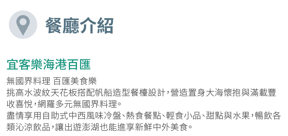 澎湖福朋喜來登酒店【宜客樂海港自助百匯】晚餐吃到飽單人券MO26