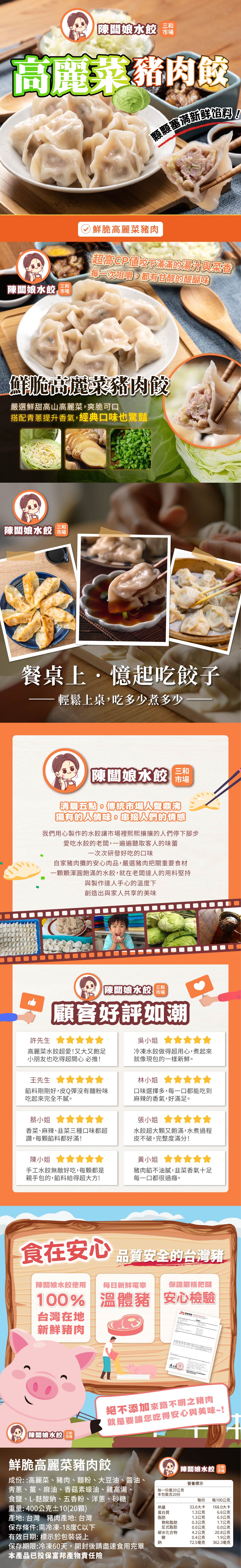 嚴選新鮮溫體豬肉,搭配清甜爽脆高麗菜或香氣濃郁韭菜,每一顆皆由豬肉攤職人手工現包,餡料扎實、比例講究。水餃皮薄不易破,煮後飽滿多汁,一口咬下肉香與蔬菜甜味交織,無論水煮、乾煎都好吃,是家中冷凍庫必備的安心美味。