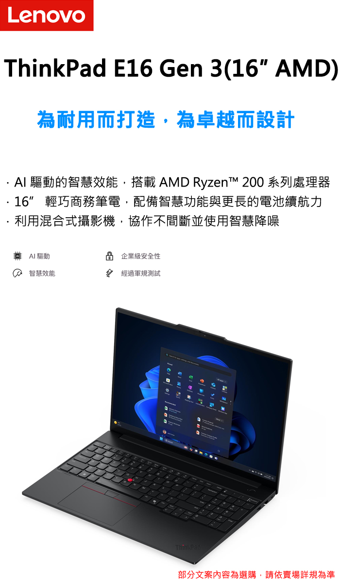 《Lenovo 聯想》ThinkPad E16 Gen 3(16吋WUXGA/Ryzen 7 250/16G/512G SSD/Win11Pro/三年保特仕)