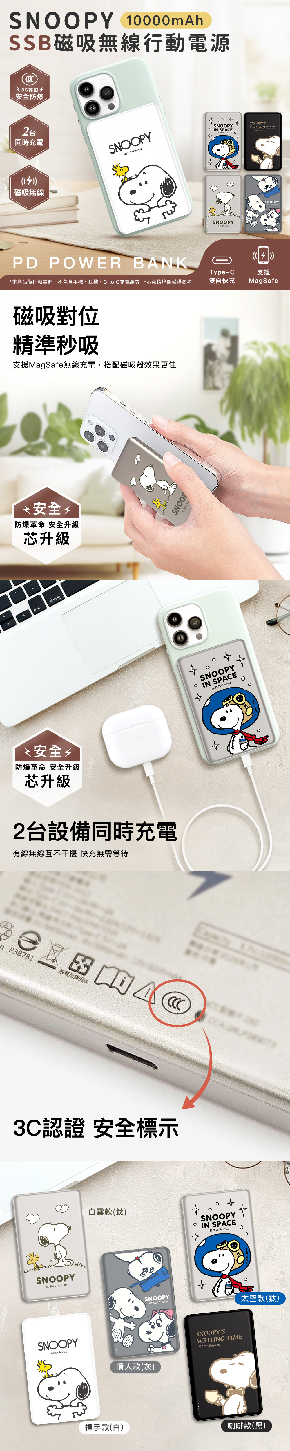 【SNOOPY史努比】SSB固態超薄磁吸無線快充行動電源10000mAh(已標示37Wh/CCC認證)-白雲款(鈦)