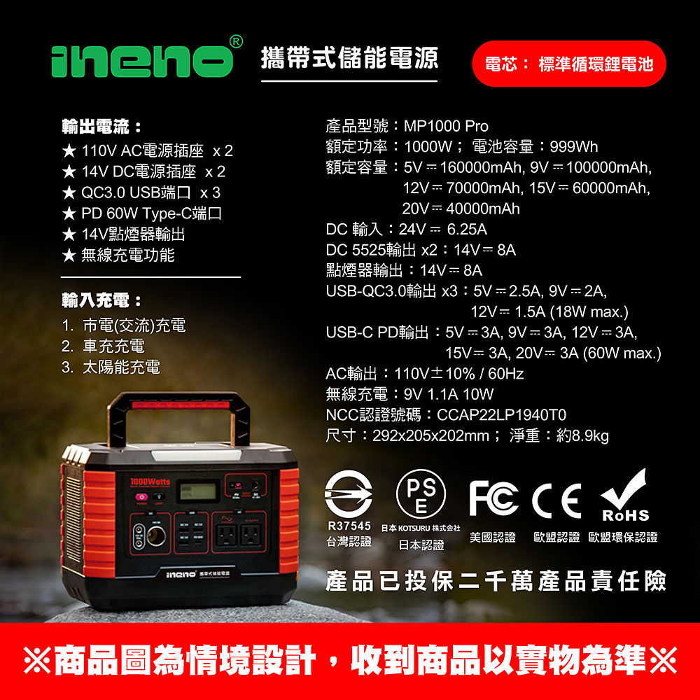 【ineno】攜帶式儲能電源1000W超大功率儲能+120W可折疊便攜式手提太陽能板/快速完整保固服務體系(含AI偵測)