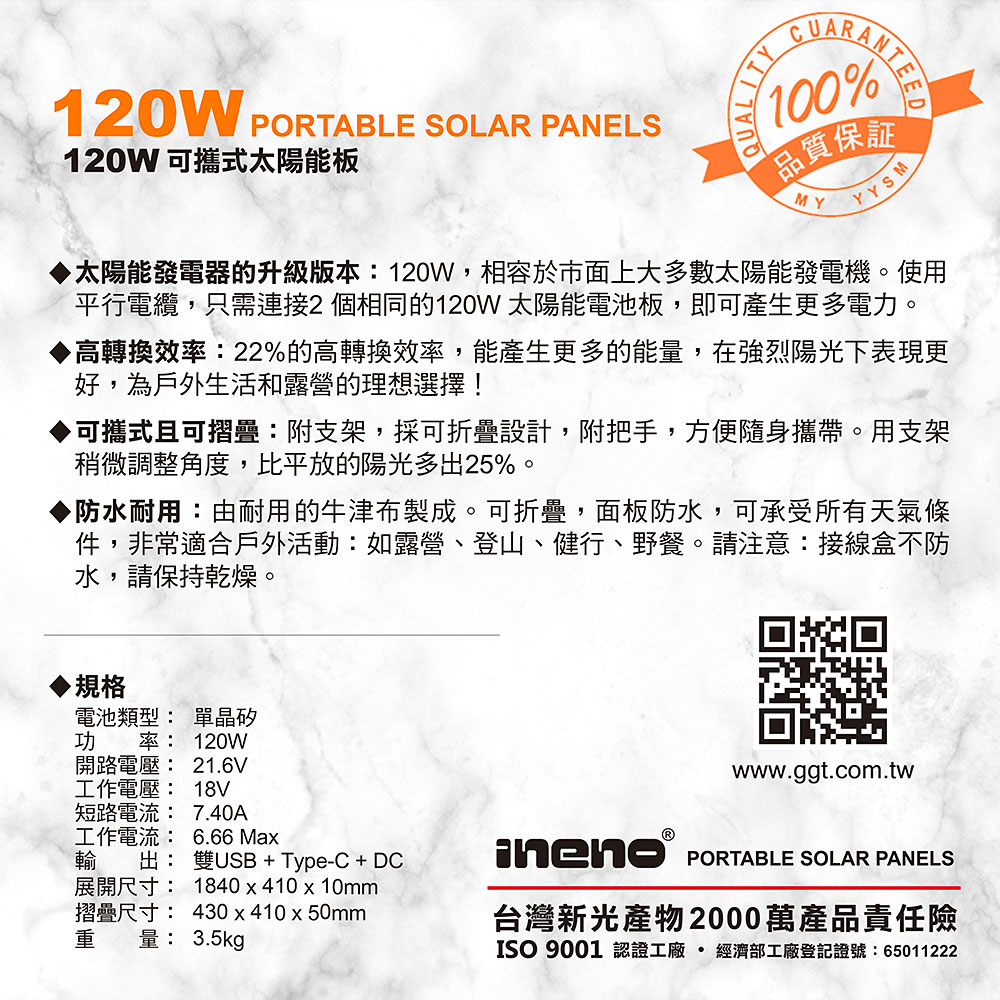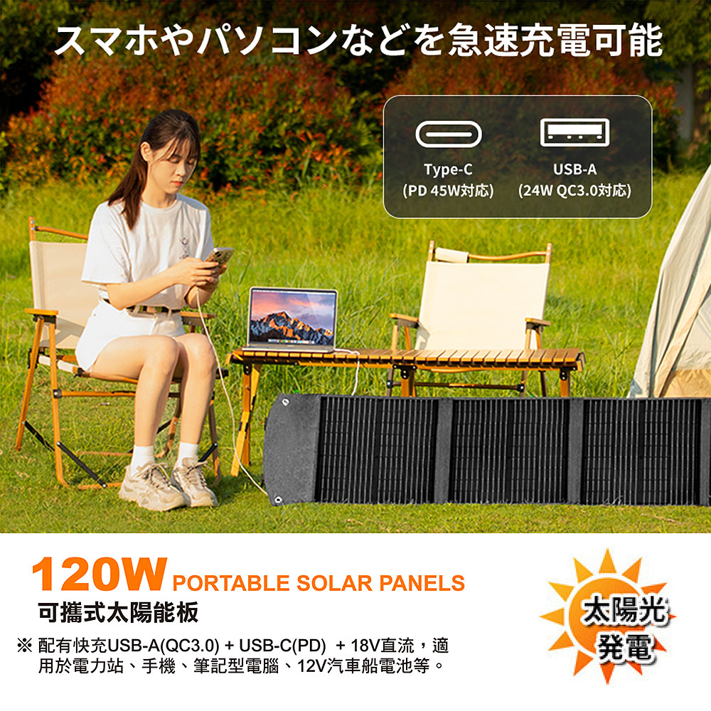 1、太陽能發電器的升級版本:120W,相容於市面上大多數太陽能發電機。使用平行電纜,只需連接2個相同的120W 太陽能電池板,即可產生更多電力。