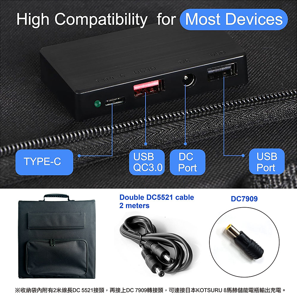 可以用太陽能板為儲能電源充電,但如果一次要使用2塊太陽能板一起充電,則需另購太陽能板並聯轉接線。(日本KOTSURU便攜式太陽能板60W/120W與太陽能板並聯轉接線都可另外選購!)