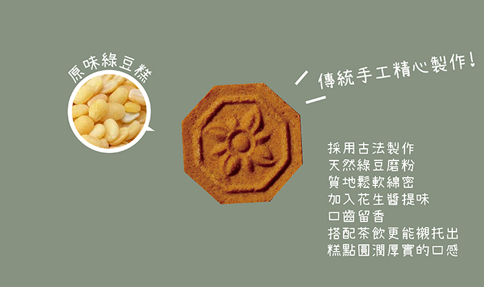 麻油綠豆糕:精選百年老店提煉的純芝麻油,純正又獨特的麻油清香,伴隨入口香氣醇厚,是傳統不變的好味道。
