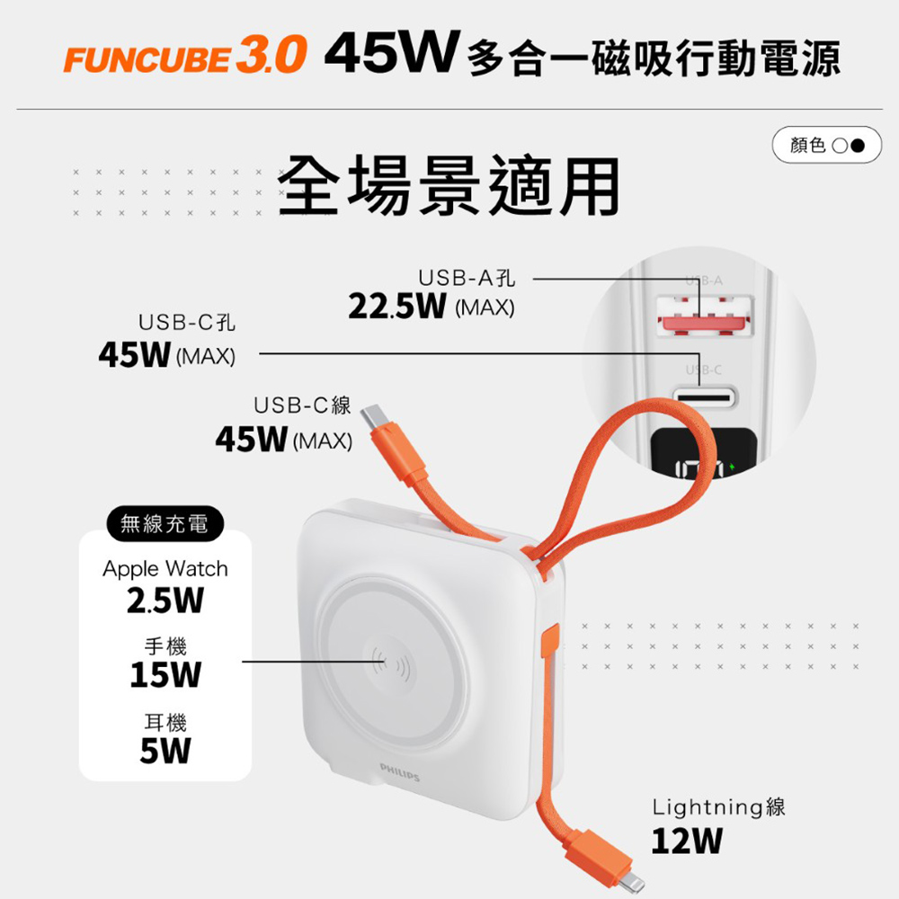 【PHILIPS飛利浦】 FunCube3.0系列 45W多合一磁吸行動電源15000mAh(DLP4351C)-黑色