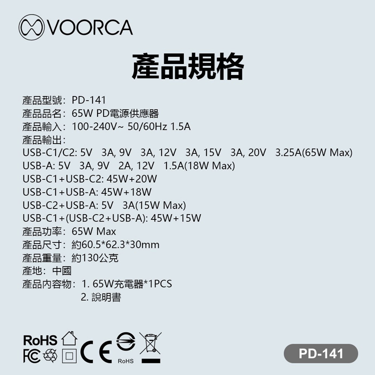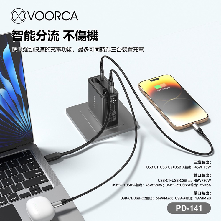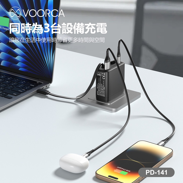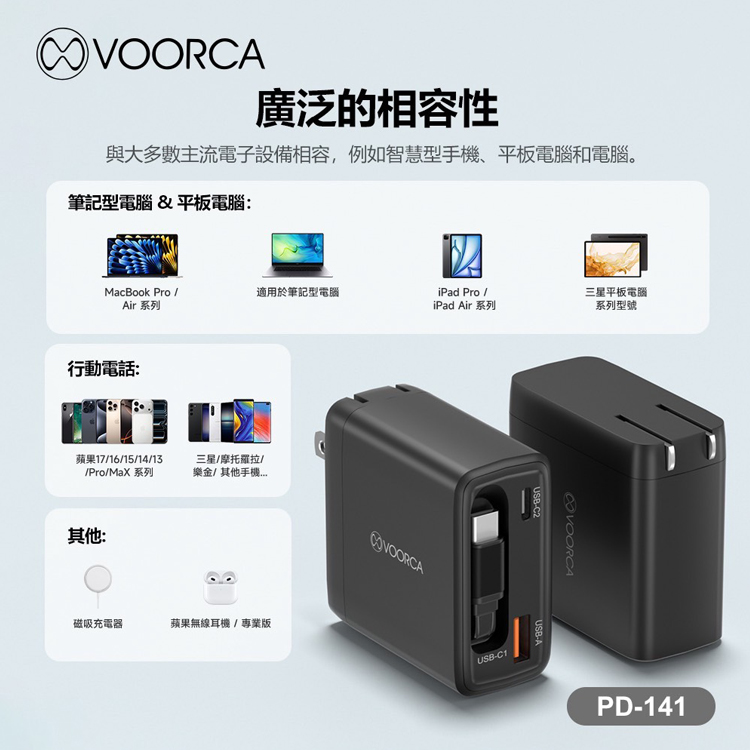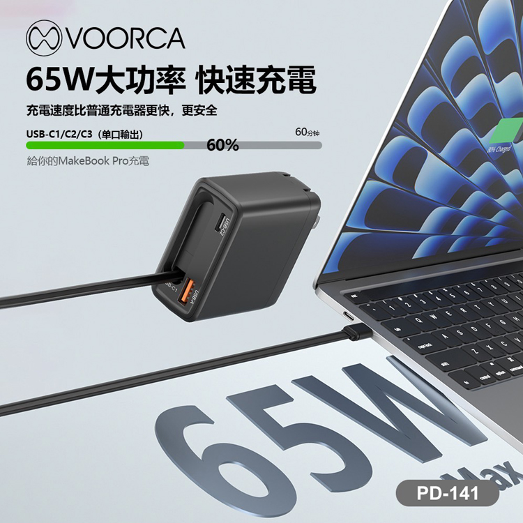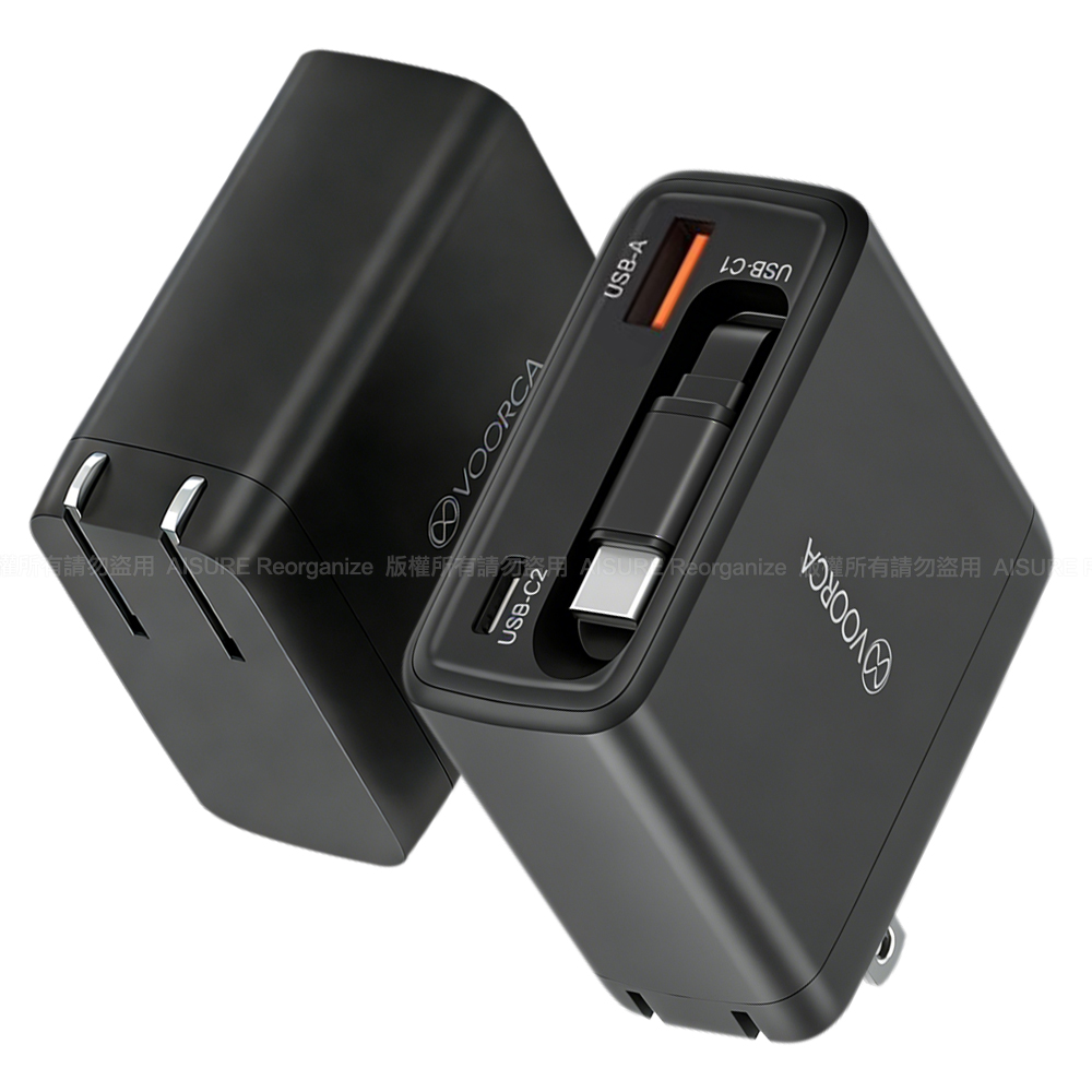 VOORCA 65W GaN氮化鎵自帶線快充(AC折疊插頭 自帶USB-C伸縮線) (USB+TypeC)