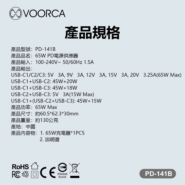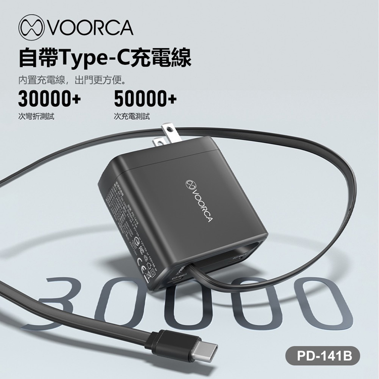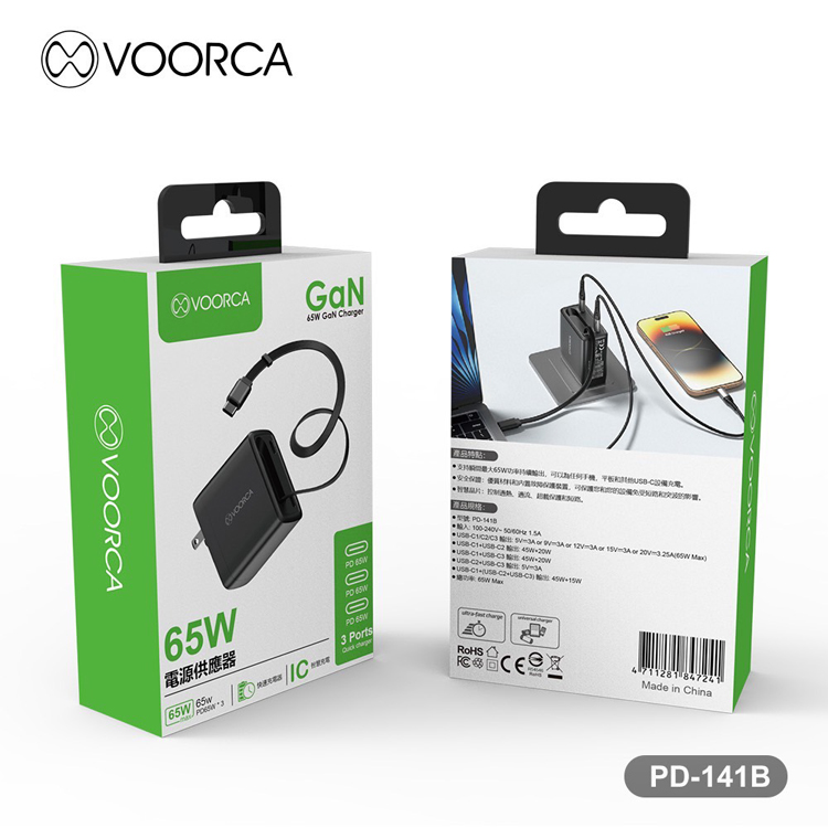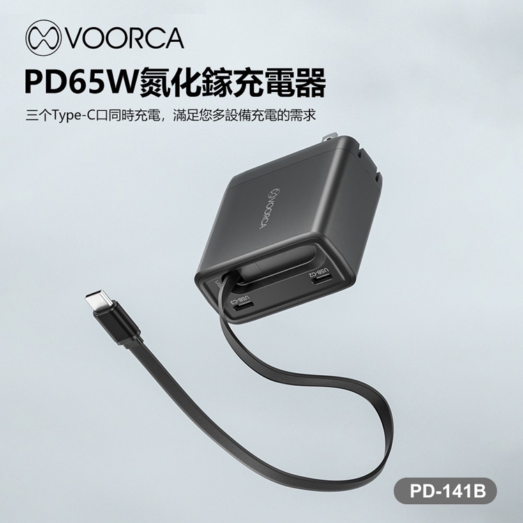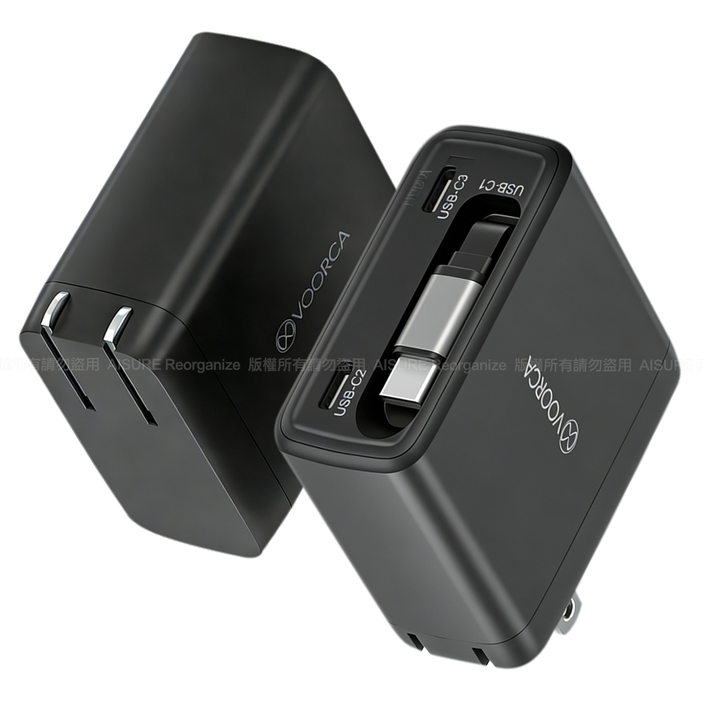 VOORCA 65W GaN氮化鎵自帶線快充(AC折疊插頭 自帶USB-C伸縮線) (3Type-C))