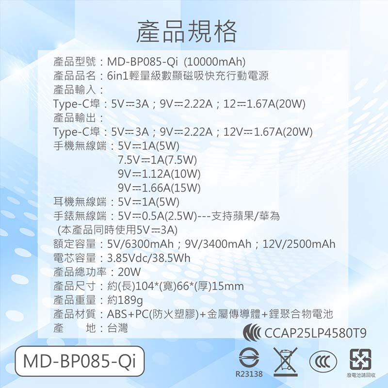 台灣製造,3C認證,標示瓦時(Wh)、支援PD、QC快充最高20W