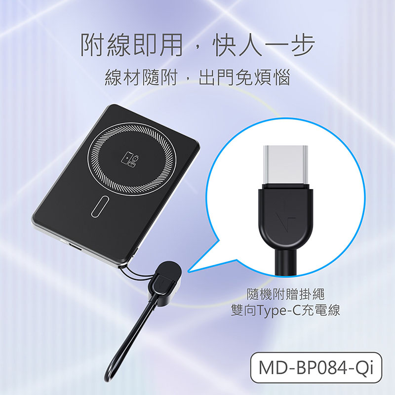 ◎ 產品內附「Type-C掛繩充電線」,無需額外攜帶線材,即可輕鬆為「蘋果手機」和「Android手機」充電。