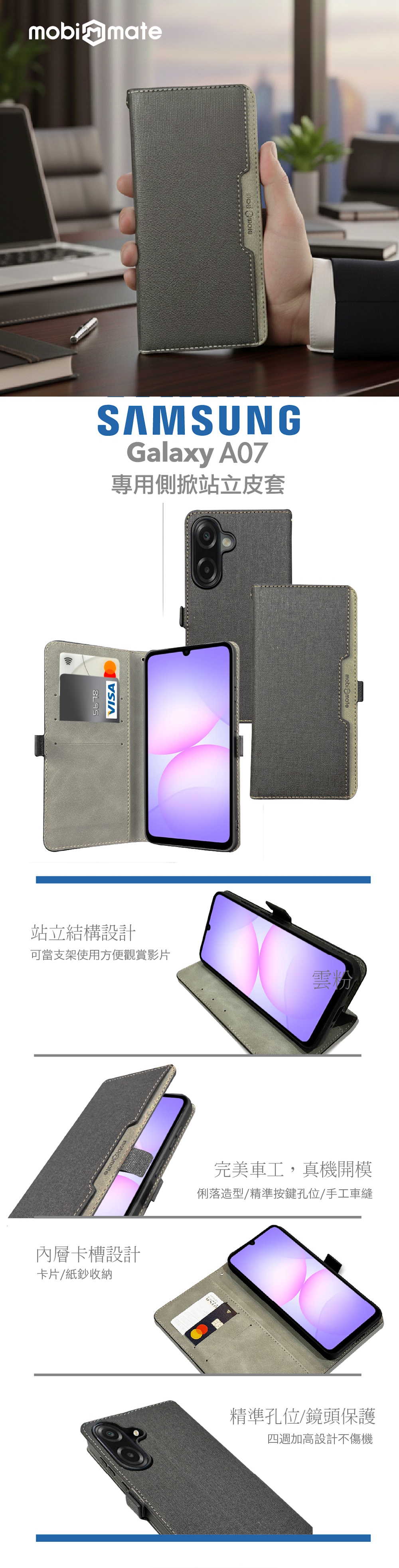 Mobi Mate Samsung A07 專用側掀站立皮套 黑