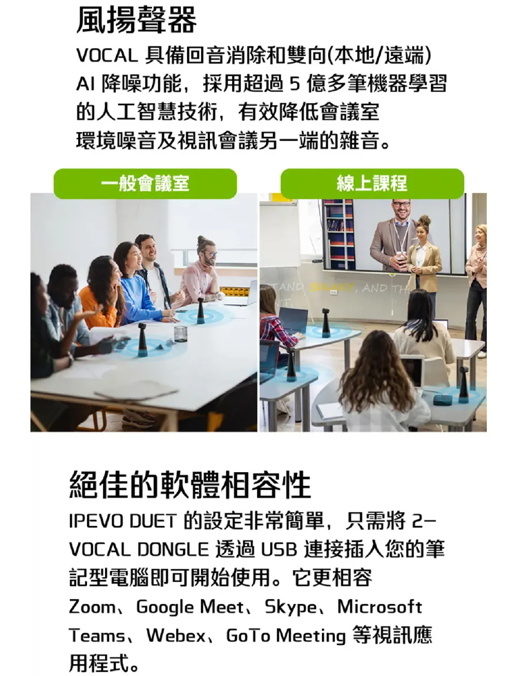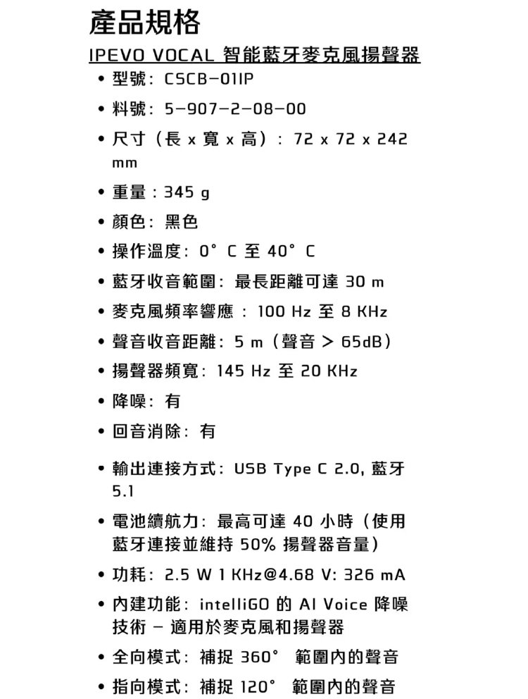 🔹內建功能:intelliGO 的 雙向AI 降噪技術 - 適用於麥克風和揚聲器、全向模式:補捉 360° 範圍內的聲音、指向模式:補捉 120° 範圍內的聲音