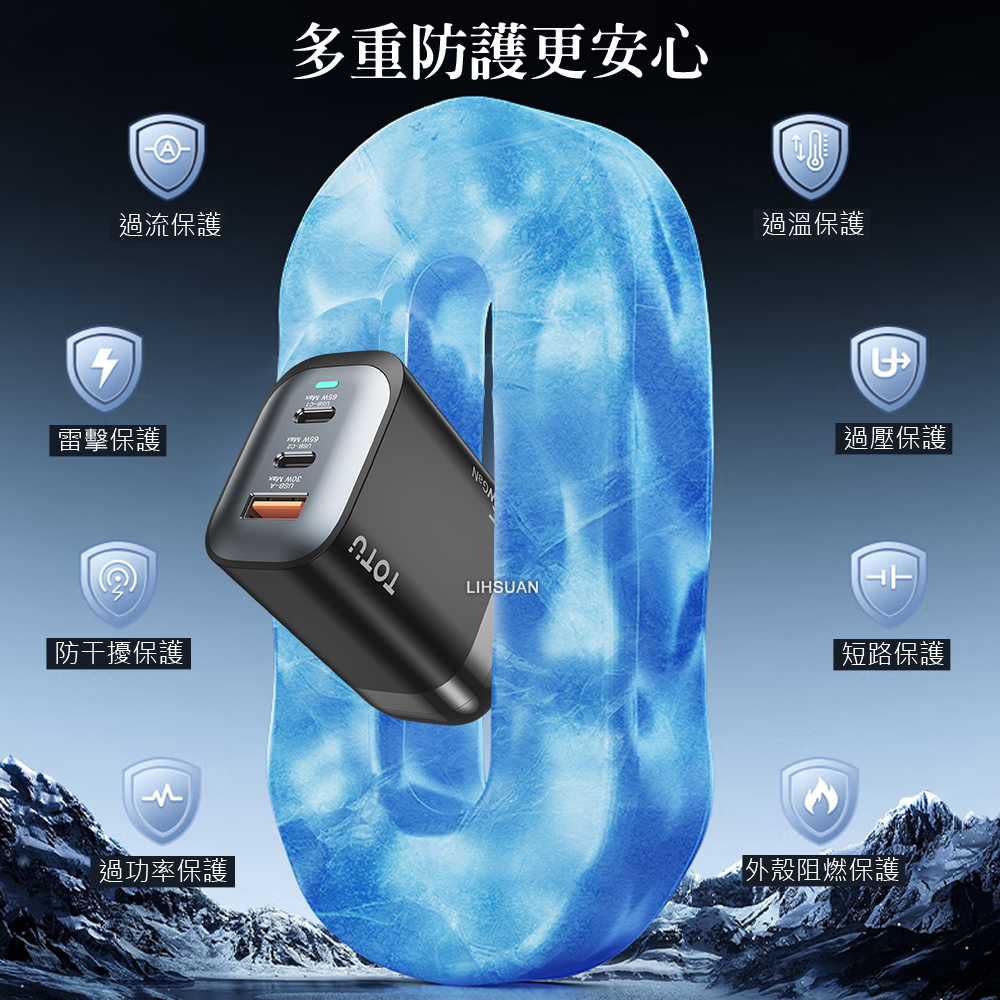 【快充組】TOTU 三孔 GaN氮化鎵 PD充電器 65W USB充電頭+雙Type-C充電傳輸線 2M 支援手機/平板/筆電