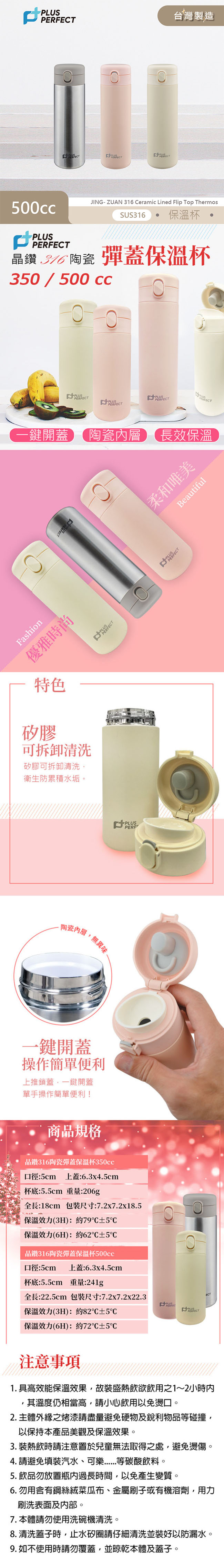 理想PERFECT 晶鑽316陶瓷彈蓋保溫杯500ml SJ-7102500 台灣製 不鏽鋼色
