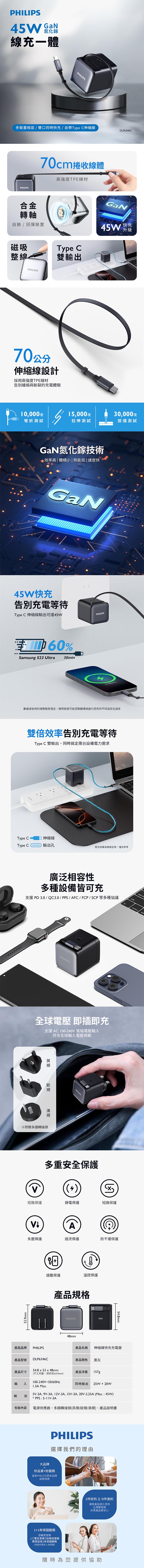 PHILIPS飛利浦 45W伸縮線電源供應器(含萬國轉接頭) DLP6346C