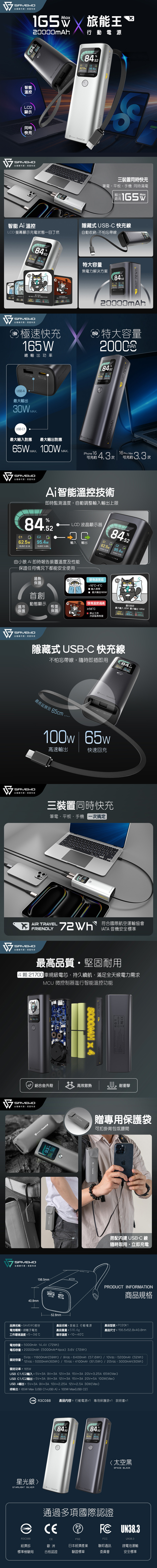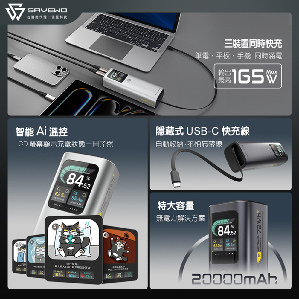 SAVEWO救世 PowerCell 旅能王行動電源20000mAh(已標示72Wh/3C認證/支援筆電充電)_星光銀