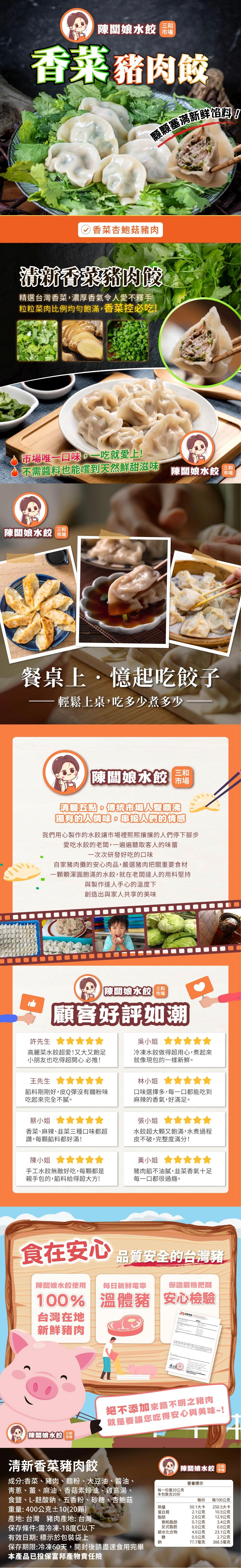 嚴選新鮮豬後腿肉,搭配手工調味內餡,每顆水餃皆由陳闆娘親自把關。黃金玉米豬肉水餃選用香甜多汁玉米粒,口感清甜不膩,大人小孩都喜歡;香菜杏鮑菇豬肉水餃結合濃郁杏鮑菇與獨特香菜香氣,層次豐富、越吃越涮嘴。皮薄餡飽、顆顆紮實,煮、煎、蒸皆美味,是餐桌與冰箱必備的安心水餃。