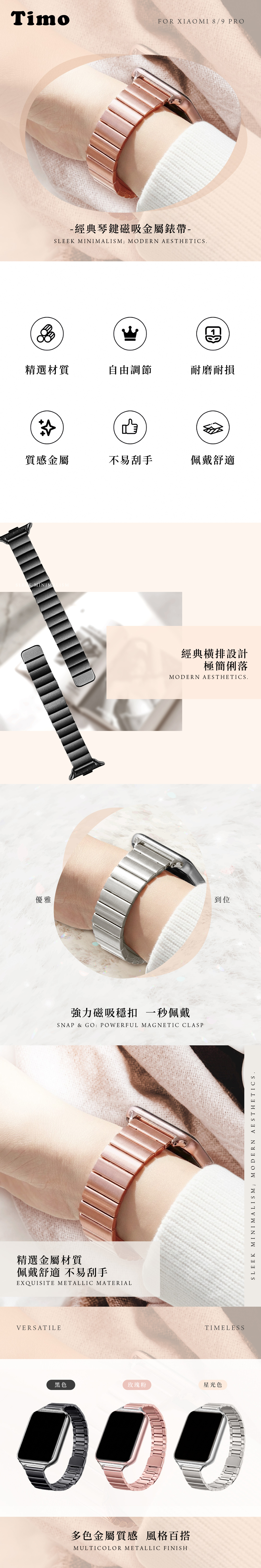 【Timo】Xiaomi 小米手環 8 Pro /9 Pro 通用款 經典琴鍵磁吸金屬錶帶_黑色