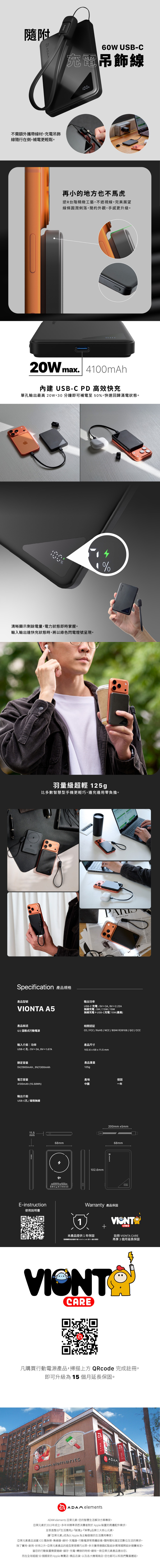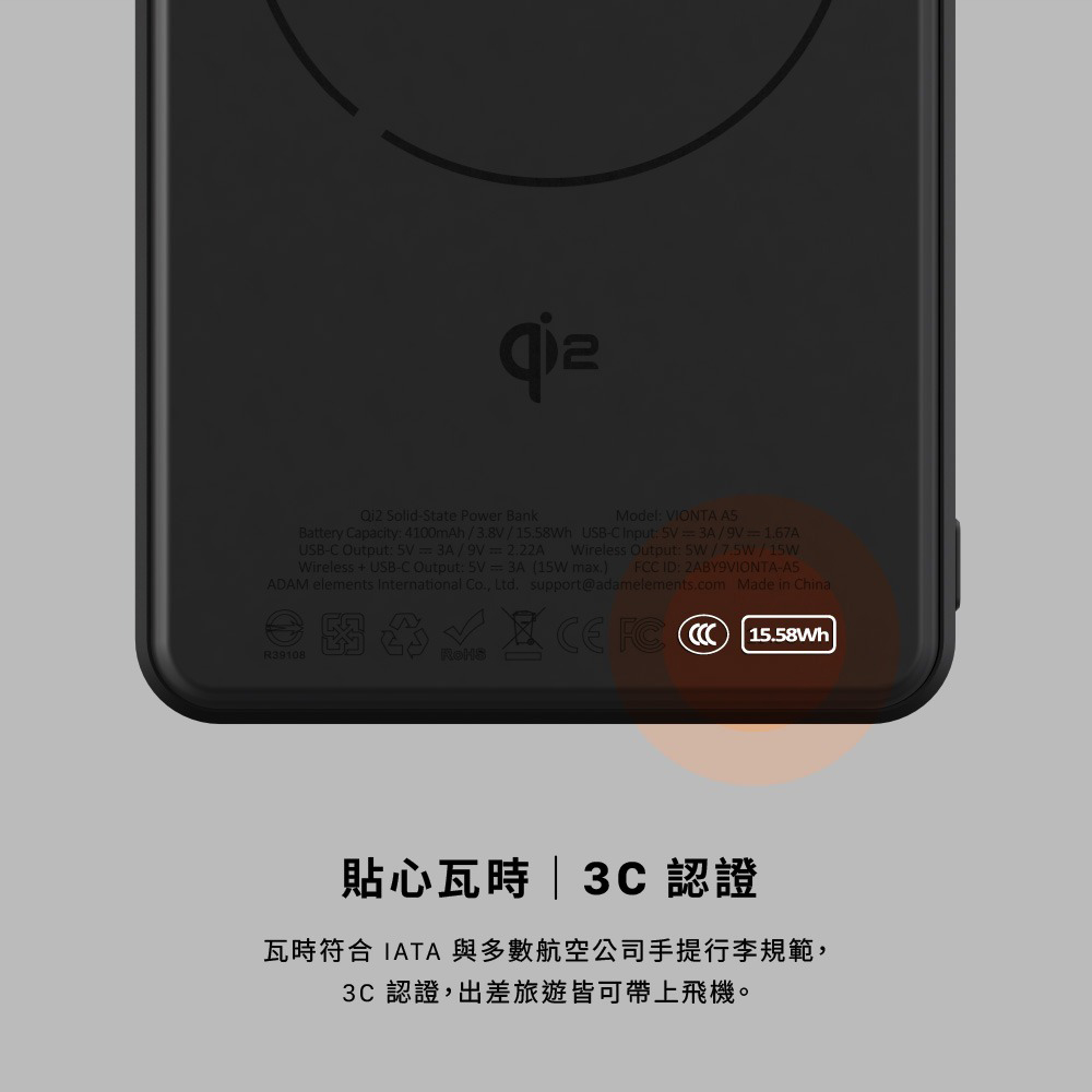 【亞果元素】VIONTA A5 Qi2 無線行動電源4100mAh(標示Wh/3C認證)-黑色