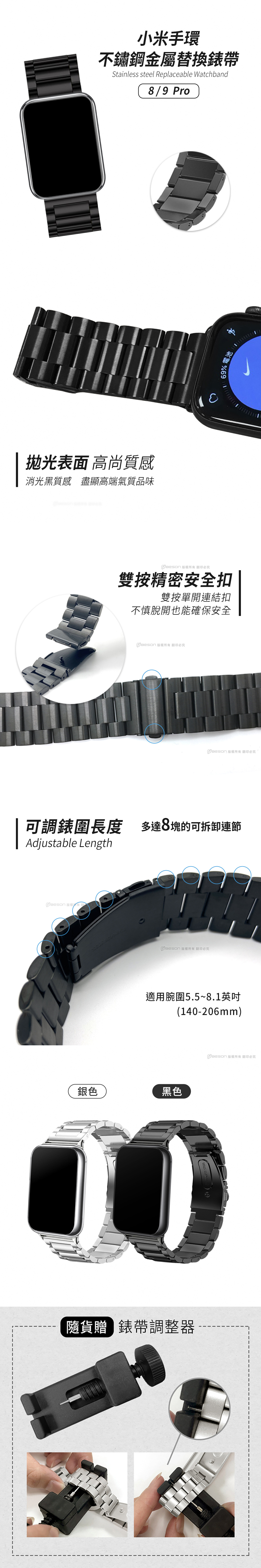 【Timo】Xiaomi 小米手環 8 Pro /9 Pro 通用款 不鏽鋼金屬替換錶帶(附錶帶調整器)_黑色