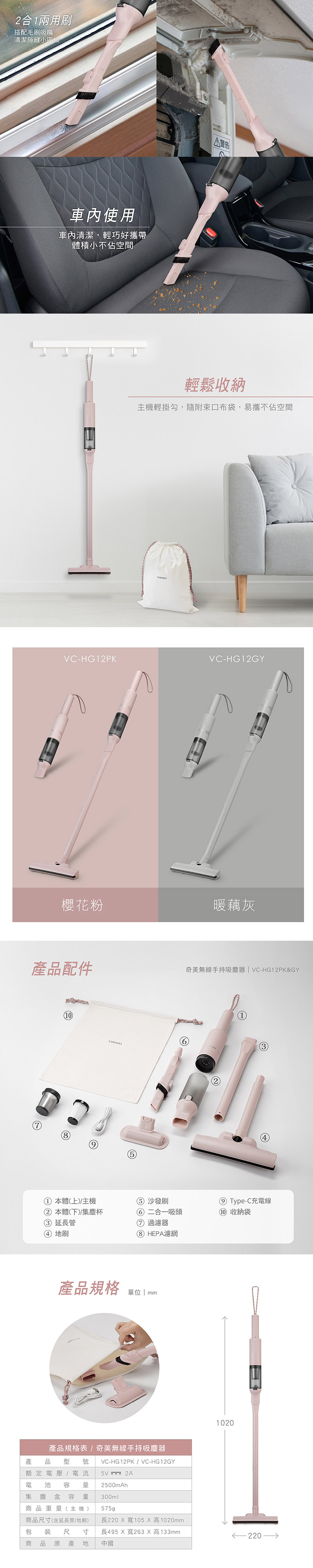 CHIMEI奇美 微旅輕淨無線手持吸塵器 櫻花粉 VC-HG12PK