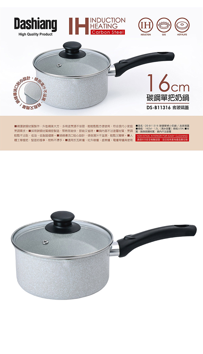Dashaiang 碳鋼單柄小奶鍋16CM(含玻璃蓋)1.5L DS-B11316