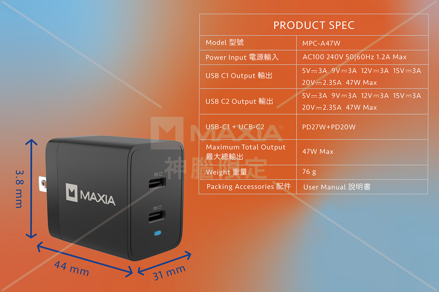 【MAXIA】氮化鎵GaN 47W急速快充組-綠線(MPC-A47W+MQC-250)