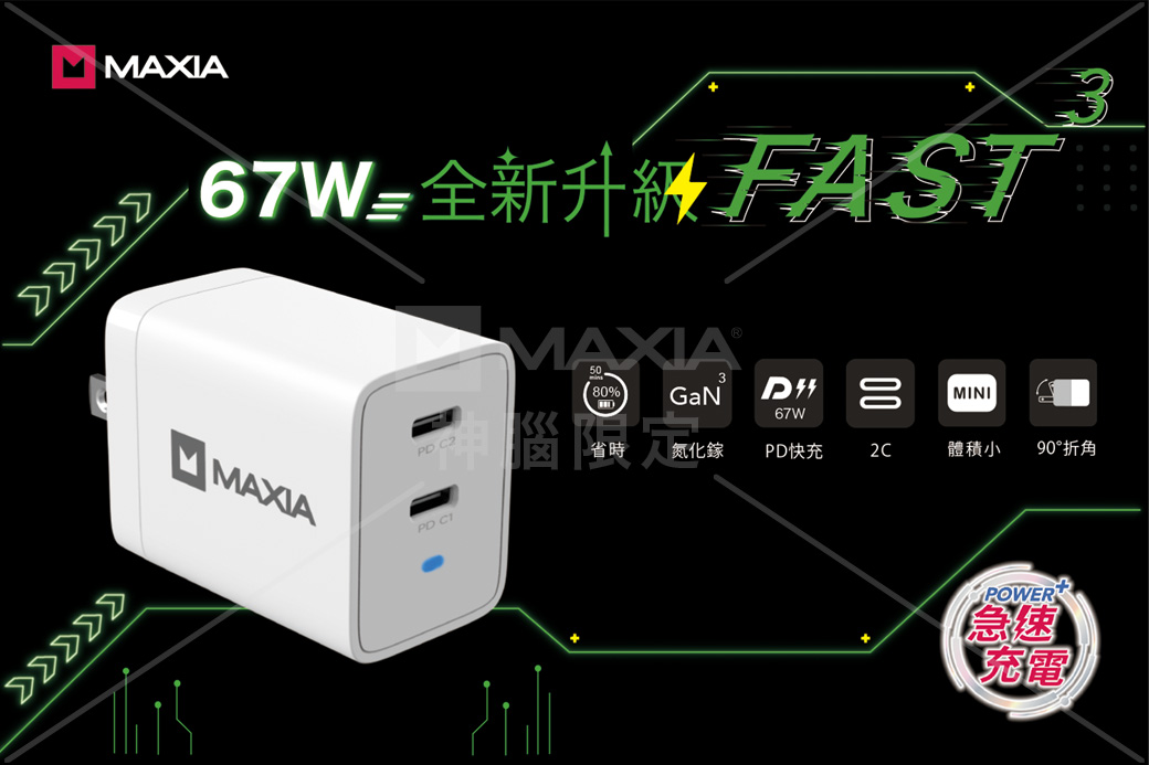 【MAXIA】氮化鎵GaN 67W急速快充組-粉線(MPC-A67W+MQC-250)