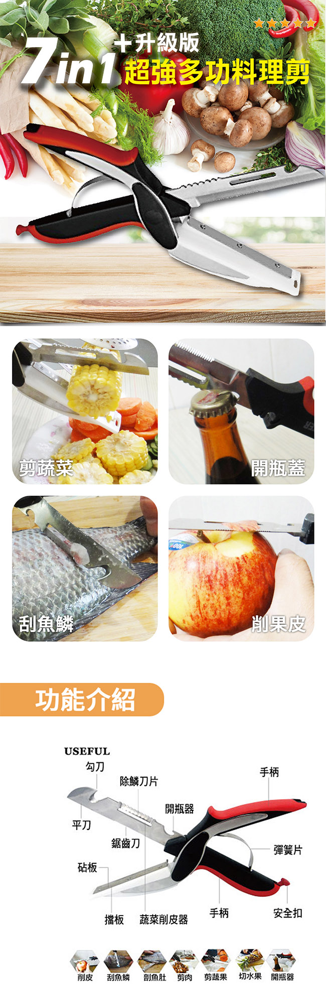 ■ 升級版,7in1超強多功料理剪 ■ 功能:削皮、刮魚鱗、剪刀、開瓶、剖魚肚、刀子、鋸齒刀 ■ 廚房萬用好幫手 ■ 居家外出露營皆適用