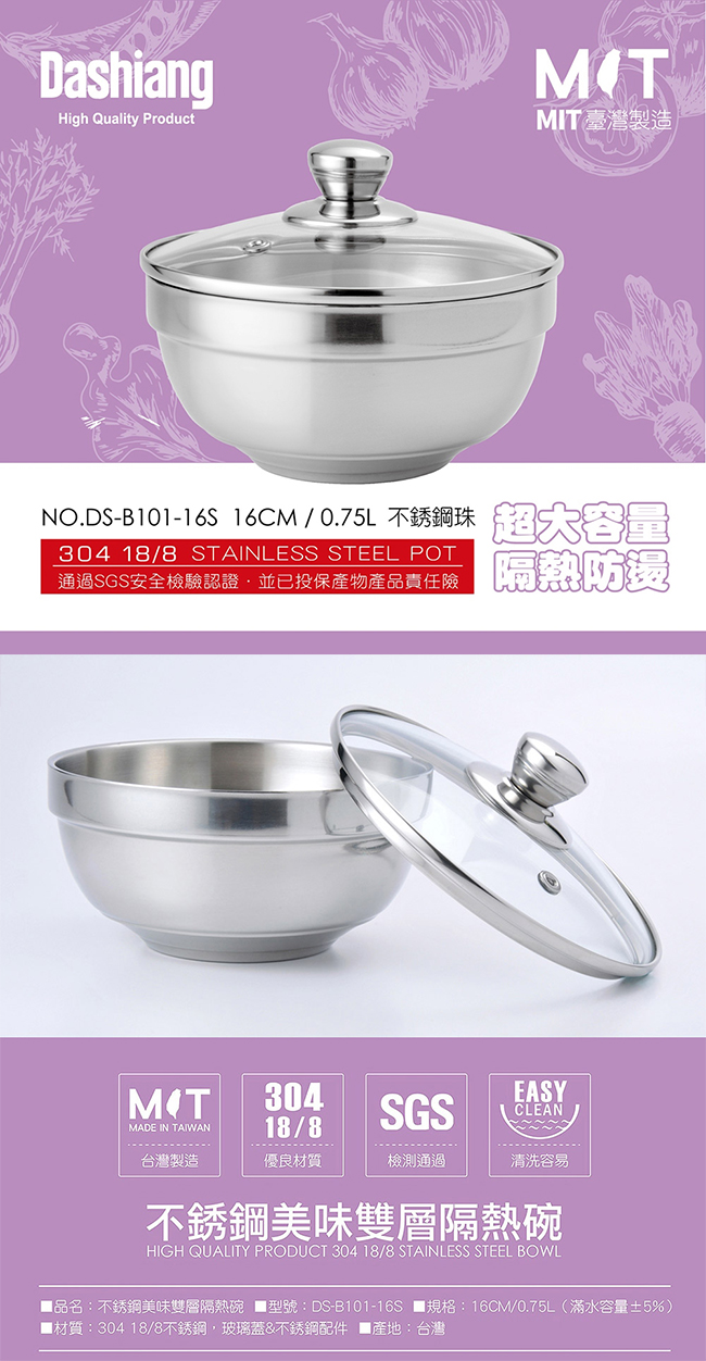 Dashaiang 304不鏽鋼美味雙層隔熱碗16CM(含玻璃蓋) DS-B101-16S 台灣製