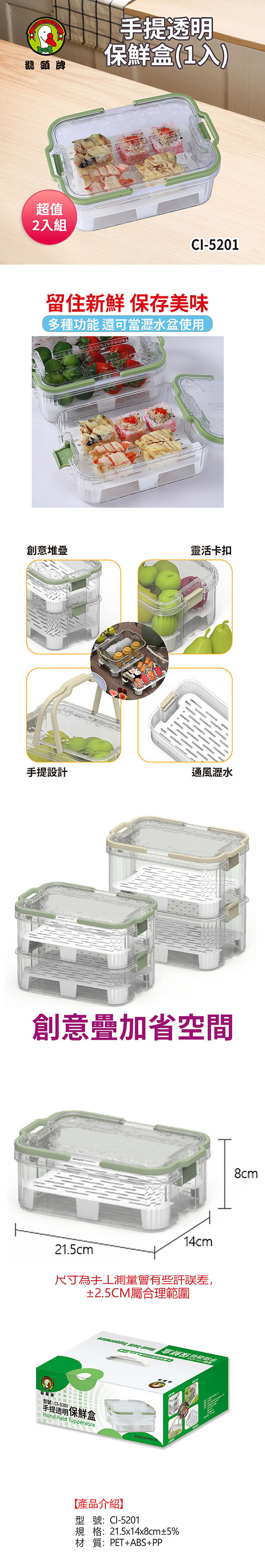 鵝頭牌 手提透明保鮮盒 CI-5201 超值二入組