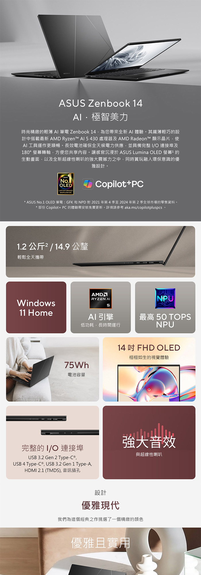 《ASUS 華碩》 UM3406GA-0042K430H(14吋WUXGA/Ryzen AI 5 430/16G/4TB SSD/Win11/二年保/特仕版)