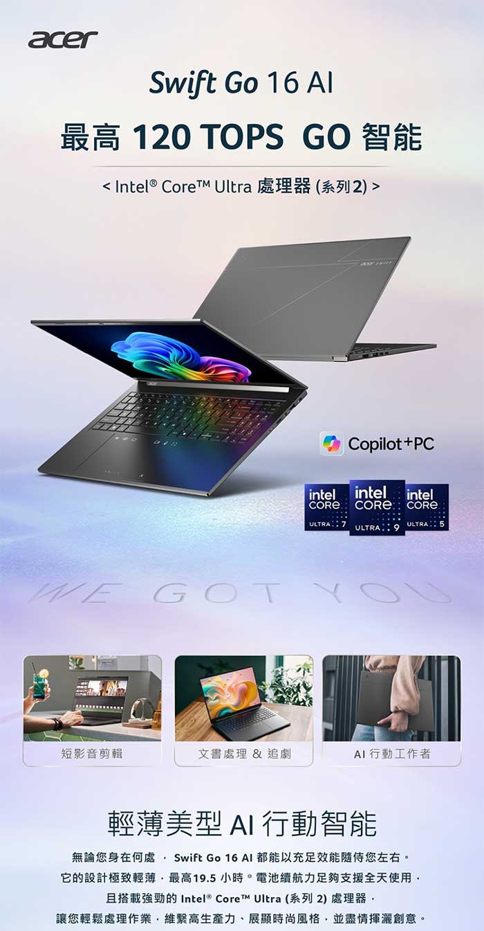 《Acer 宏碁》 SFG16-74-79T3 (16吋WUXGA+/Ultra 7 258V/32G/1TB+4TB SSD/Win11/兩年保/特仕版)