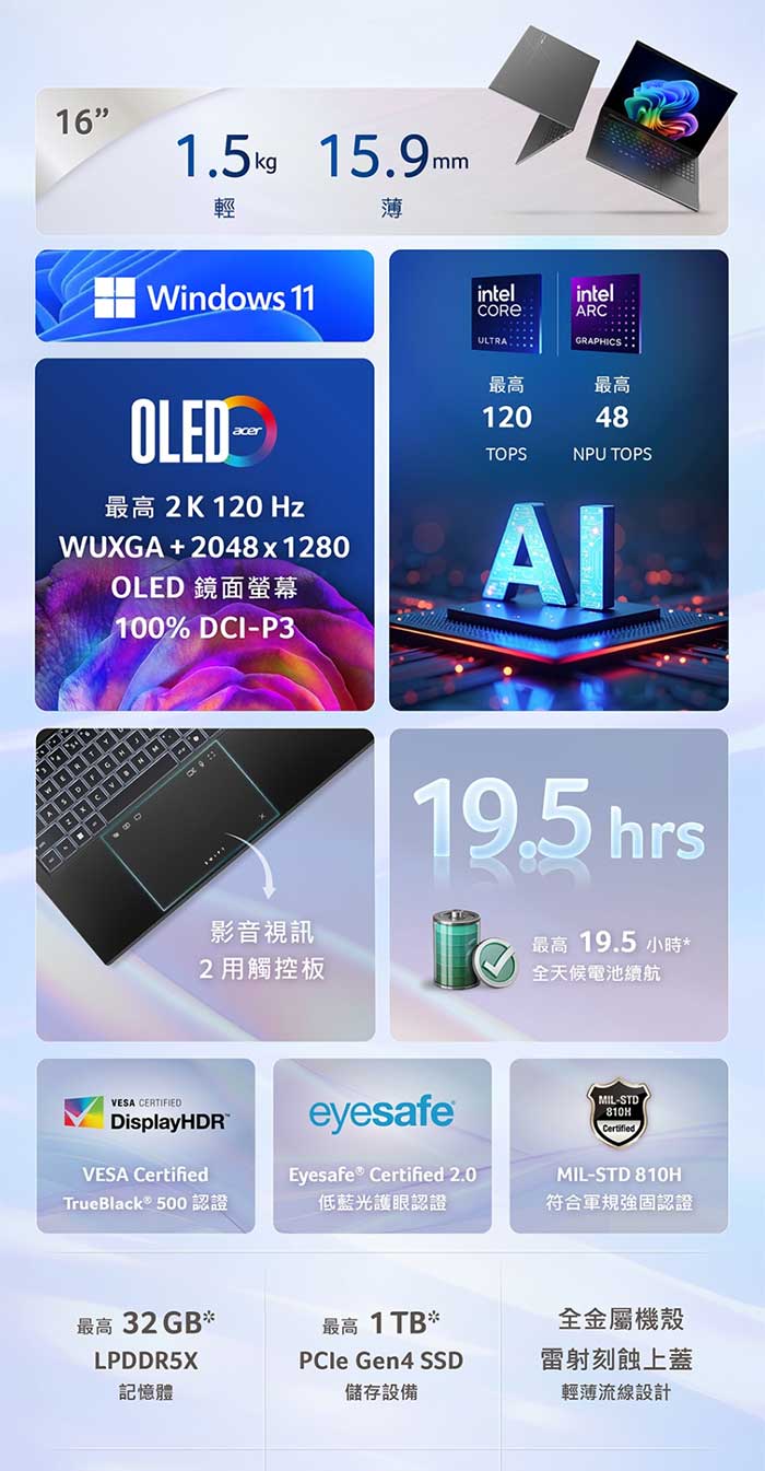 《Acer 宏碁》 SFG16-74-91FX (16吋WUXGA+/Ultra 9 288V/32G/1TB+2TB SSD/Win11/兩年保/特仕版)