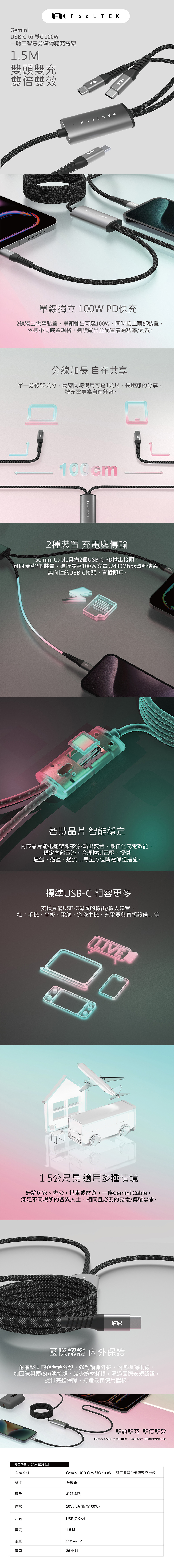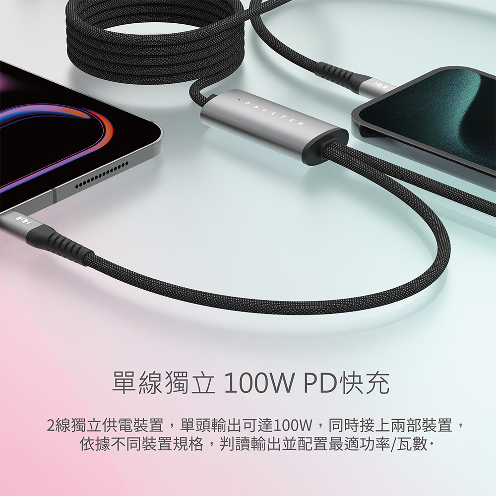 【Feeltek】Gemini USB-C to 雙C 100W 一轉二智慧分流傳輸充電線1.5m
