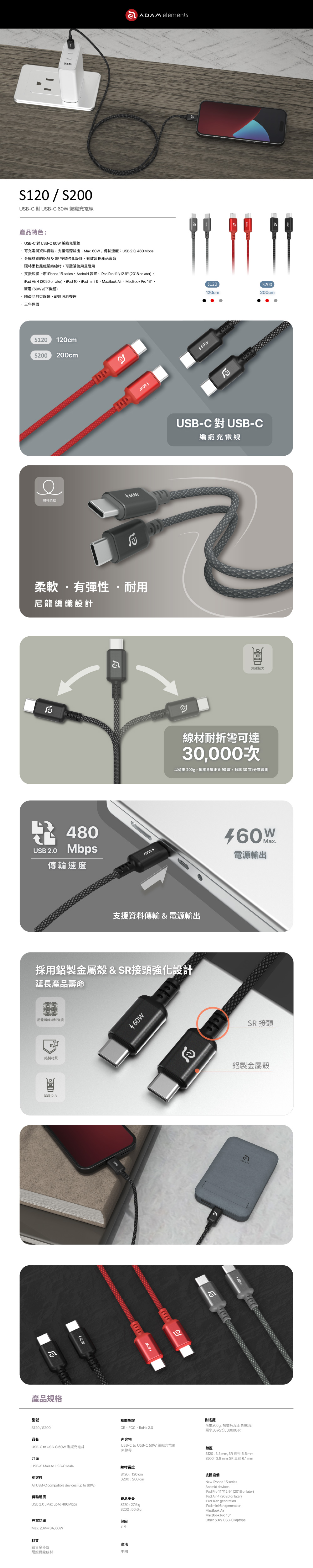 【亞果元素】S120 USB-C 對 USB-C 60W 編織充電傳輸線120cm-灰