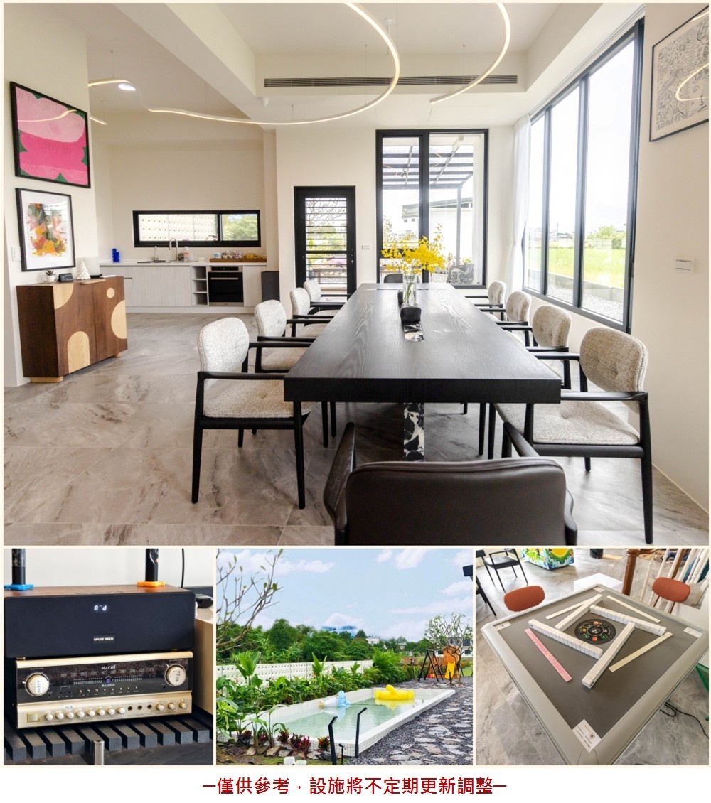 ●附設戶外泳池、溜滑梯、盪鞦韆、電動麻將桌…